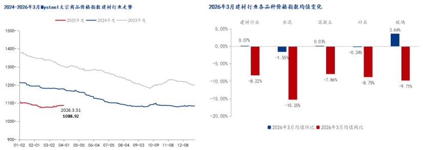 1.價格運行情況:3月份,受節(jié)后復工、天氣轉(zhuǎn)暖、施工旺季等季節(jié)性因素主導,建筑行業(yè)逐步復蘇,Mysteel 建材價格指數(shù)穩(wěn)中偏強運行,3月均值為1083.58點,月環(huán)比上升0.07%,年同比降幅收窄至8.22%。具體品種方面,水泥(環(huán)比-1.55%、同比-15.25%)、混凝土(環(huán)比+0.03%、同比-7.86%)、砂石(環(huán)比-0.24%、同比-8.75%)三大建筑主材價格均值漲跌互現(xiàn),但本期期末值均較期初值有所回升。
