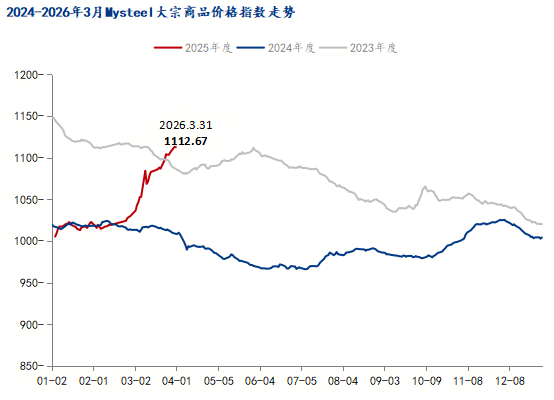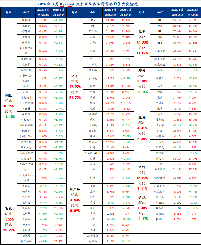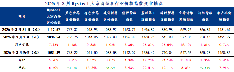 2026年3月,Mysteel大宗商品價格指數(shù)均值為1081.39,環(huán)比上升5.90%,同比增加6.60%。9大行業(yè)中,同環(huán)比表現(xiàn)有所分化:所有行業(yè)價格指數(shù)均值環(huán)比上漲,其中,基礎化工、橡膠塑料、化學纖維較上月實現(xiàn)兩位數(shù)增長;而同比數(shù)據(jù)除黑色金屬、建筑材料、造紙3個行業(yè)價格指數(shù)均值較去年同期有所下滑外,其余6個行業(yè)指數(shù)均值同比增長。